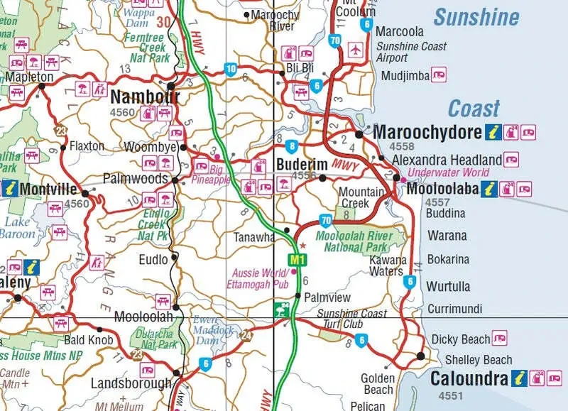 • Primary Map of the greater Brisbane area at a scale of 1:100,000 which features Brisbane and surrounding regions (including Bribie Island, Coomera & Ipswich) as well as major highways, 24-hour fuel stops and other points of interest