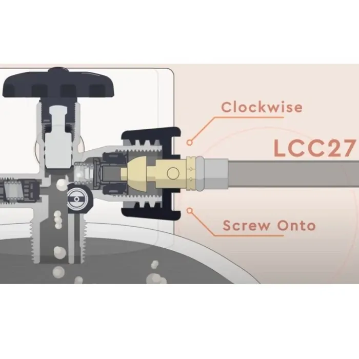 - The new style fitting attaches to the LCC27 valve using the outside thread, rather than the inside. It is easier to attach due to the large plastic nut and is screwed on in a clockwise direction.