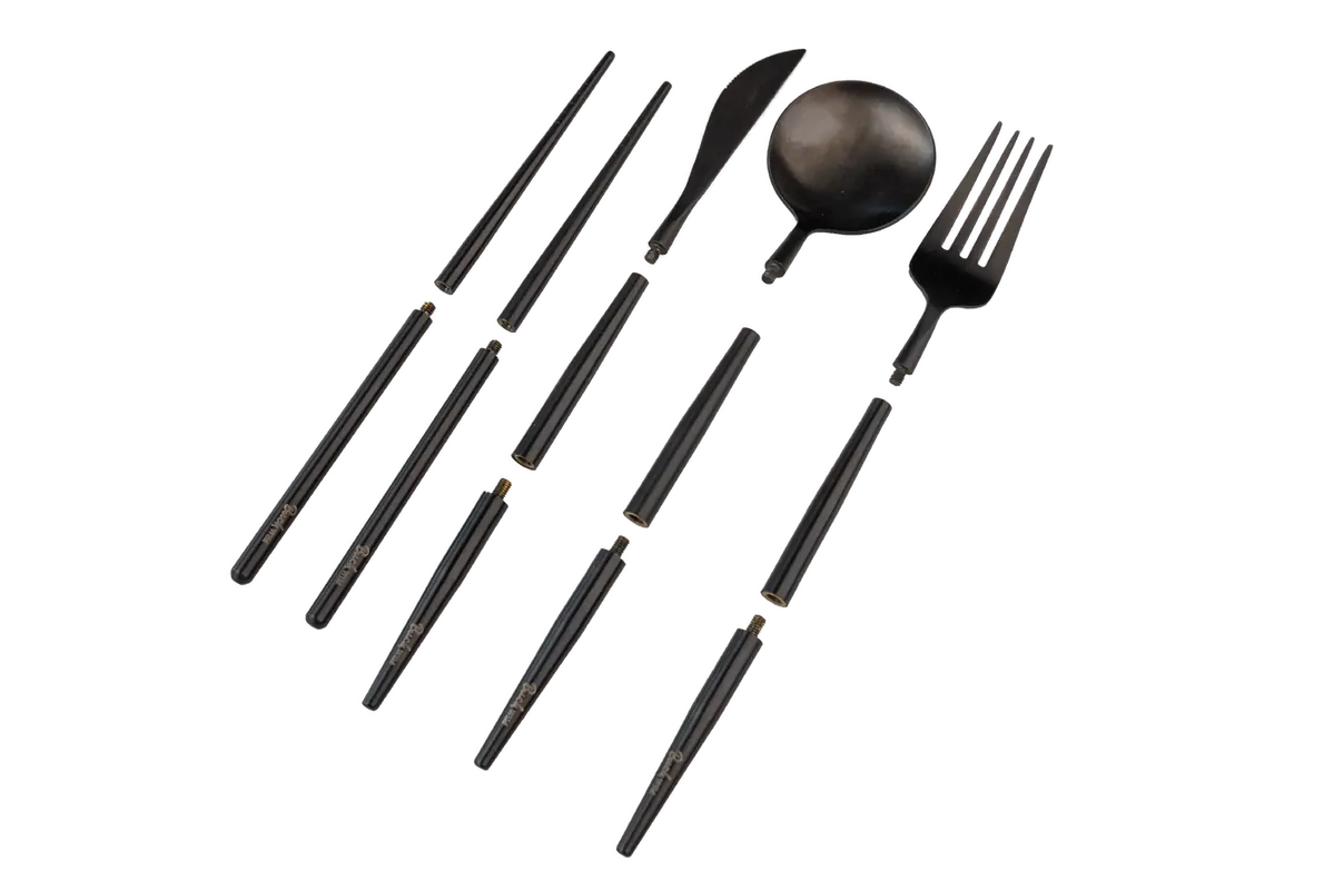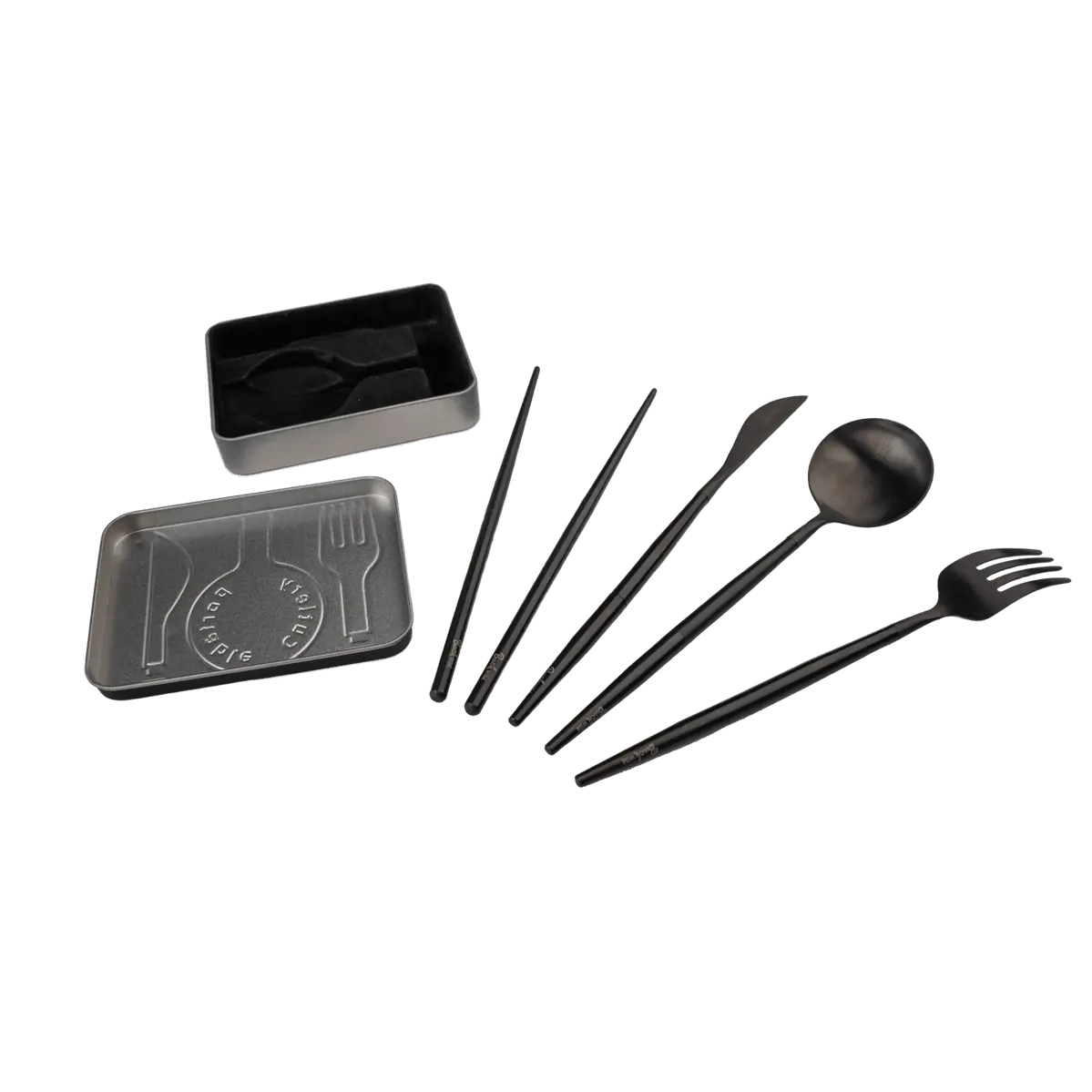 Included in this set is a sleek satin bag to safely & securely store your cutlery set & all its pieces. When stored in this heavy duty bag, this set is the lightest & smallest portable cutlery set on the market to date, what a game changer!