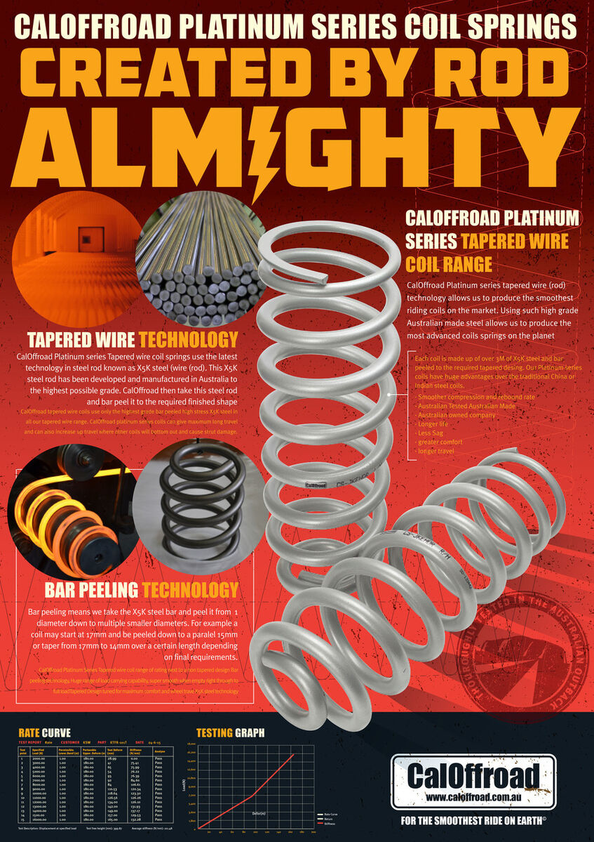 CalOffroad Heavy Duty Platinum Series Rear Coil Springs are designed and manufactured in Australia using high-grade Australian made steel suited specifically to the Ranger Raptor running Fox coilovers. The Fox Coilovers feature internal bypass technology and we have built our coils to work on this Fox platform. Dyno testing has been carried out to ensure the coil rate is tuned to match the shock valving, achieving the smoothest possible ride. These coil springs are a must have for any Raptor running additional weight on the rear, as they will support the extra weight of your truck, as well as maintain its height.