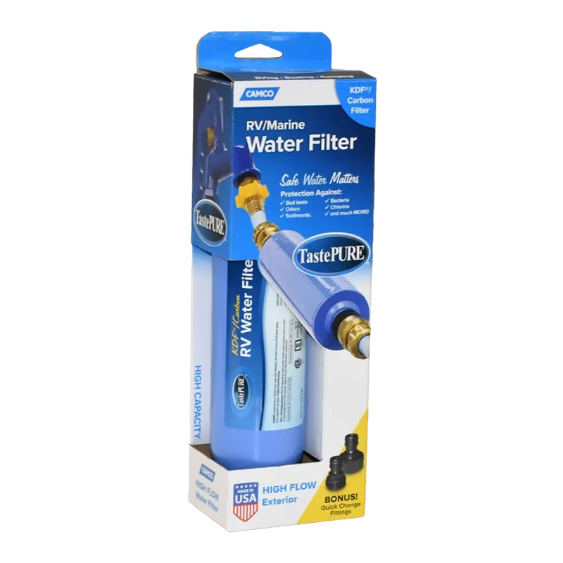 Camco’s Taste PURE RV/Marine Water Filter with Flexible Hose Protector reduces bad taste, odour, chlorine and sediment in drinking water with a 20-micron sediment filter. Also features GAC (Granular Activated Carbon) filtration in combination with KDF to prevent undesirable bacteria growth when the filter is not in use.