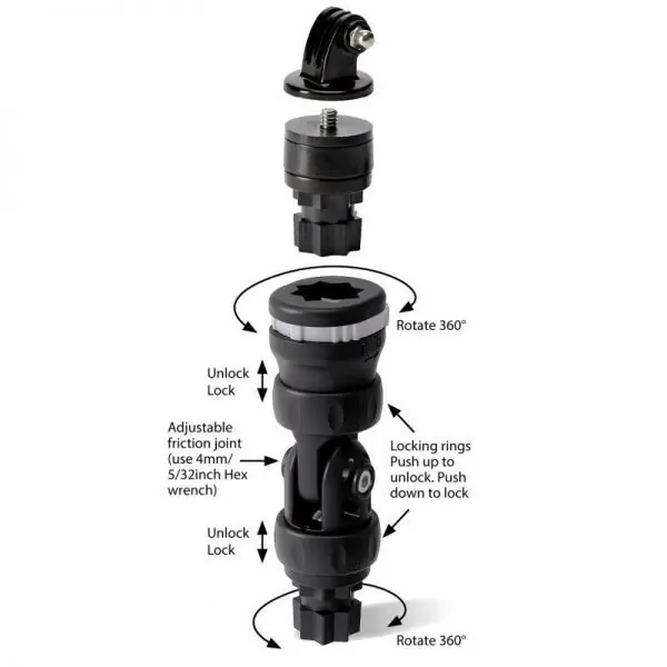 This compact camera mount allows you to adjust your camera to every angle with friction joints our patented R-Lock system. You can also transfer it to any RAILBLAZA mount. Features • Fits all cameras with a ¼ 20 thread insert allowing them to become StarPort compatible • Kit includes GoPro tripod adaptor • Mounts on rails, boats, kayaks and inflatables with the correct RAILBLAZA mount • Can be extended using RAILBLAZA Camera Booms or Extenders • UV stabilised materials.