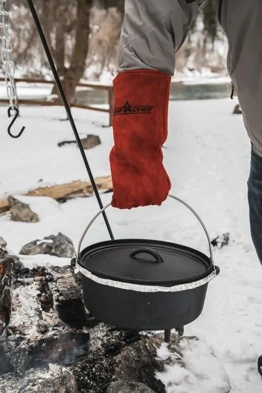Protect your hands and arms while cooking. These high-quality leather gloves will guard against heat and are perfect for Dutch oven cooking, frying or any other type of cooking that may require additional protection.