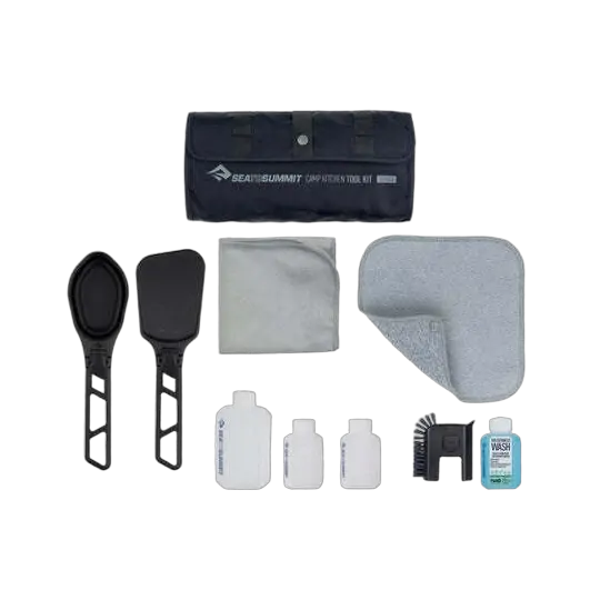 - All-in-one cooking and washing kit: Includes Folding Camp Spatula, Folding Camp Serving Spoon, Pot Scrubber, 50ml Wilderness Wash, two 50ml and one 100ml reusable spice/oil bottles, double-sided Wash Cloth and a DryLite Dish Towel