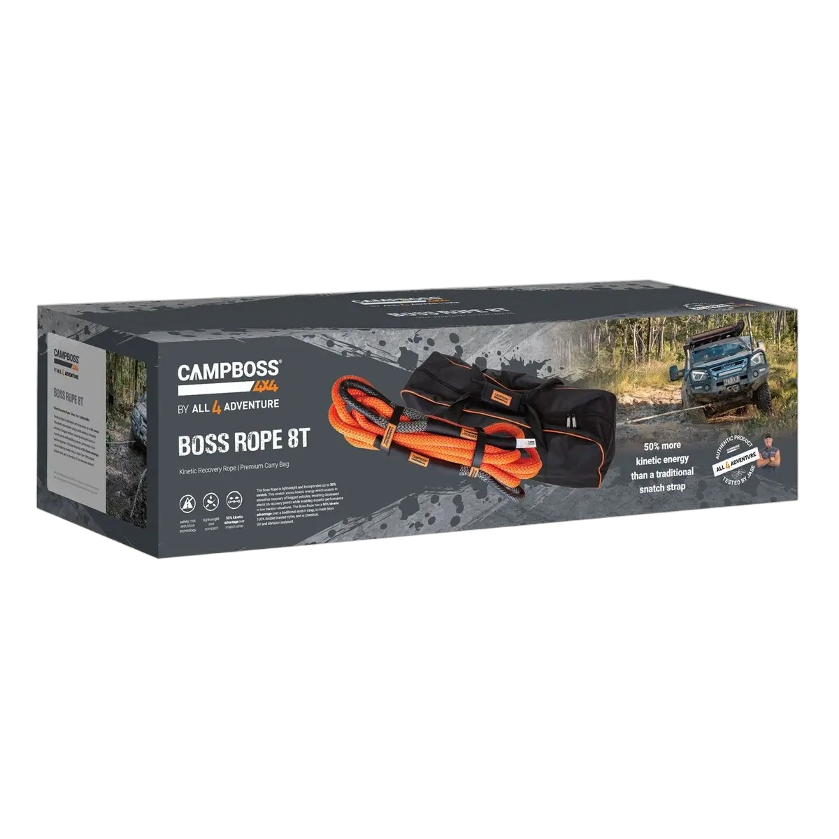 The Boss Rope is lightweight and incorporates up to 30% stretch. This stretch stores kinetic energy which assists in smoother recovery of bogged vehicles: meaning decreased shock on recovery points while enabling superior performance in low traction situations. The Boss Rope has a 50% kinetic advantage over a traditional snatch strap, is made from 100% double braided nylon, and is chemical, UV and abrasion resistant.