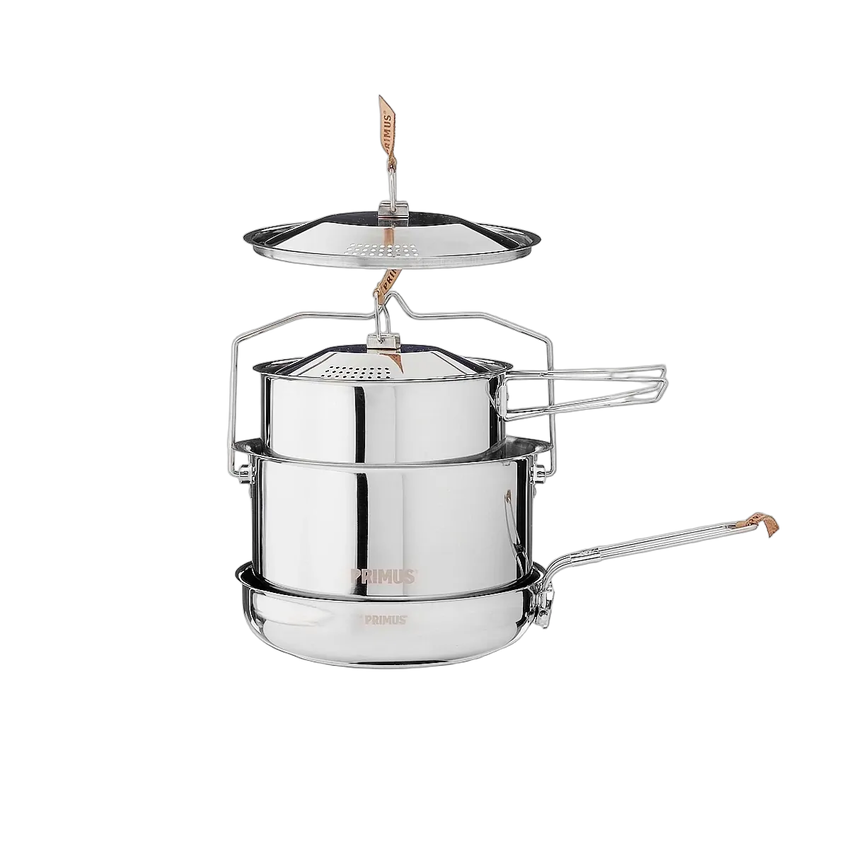 Durable 18/8 stainless steel Primus cookset - a genuine workhorse designed to withstand years and years of service. Each set consists of two pots, two lids with integrated colanders and a frying pan with an integral handle.