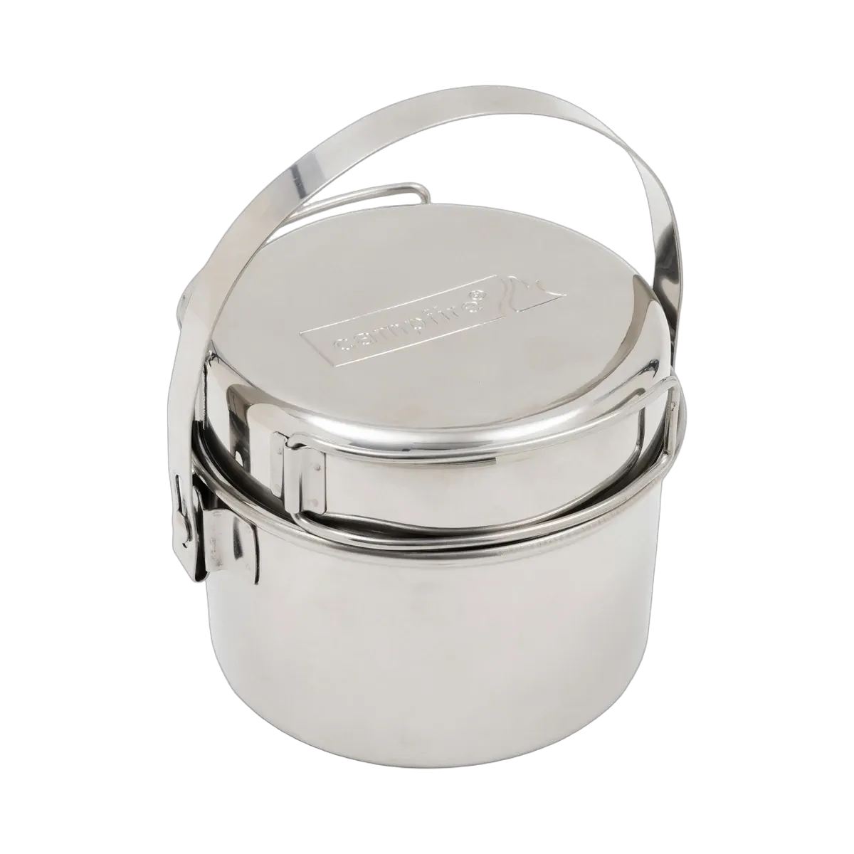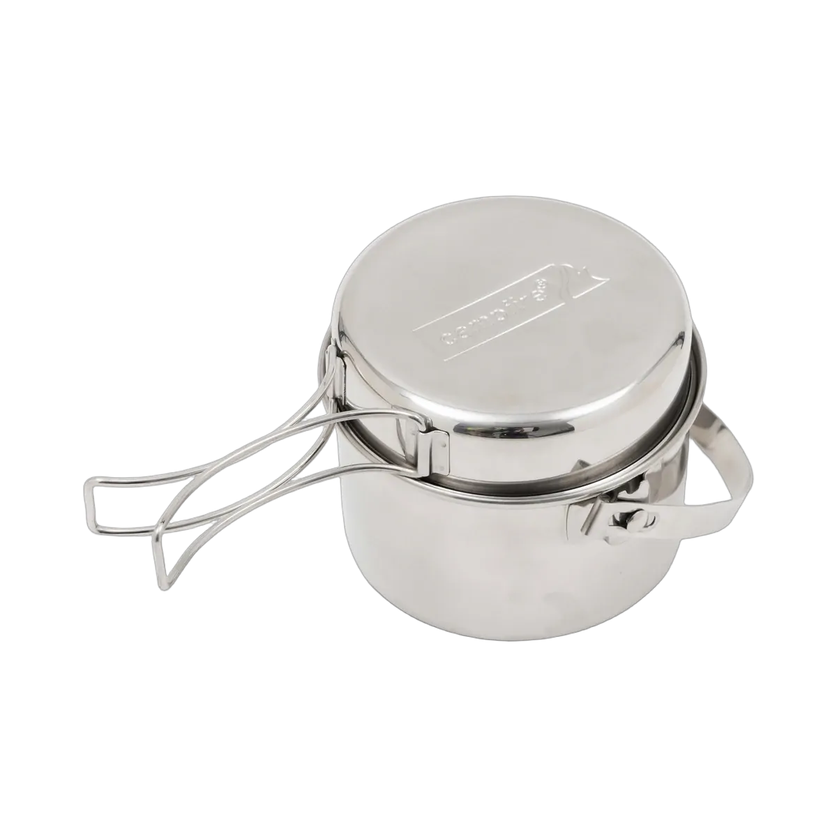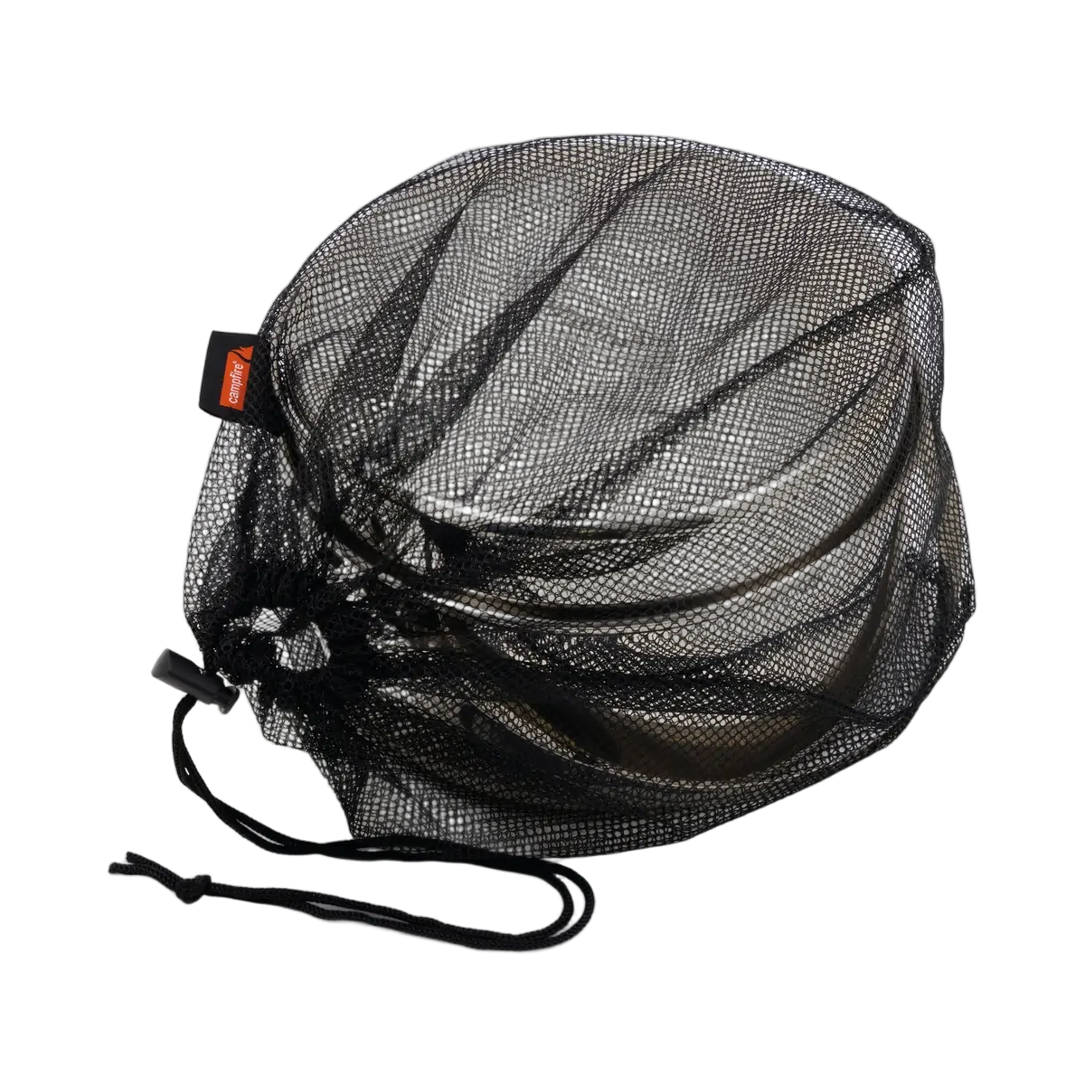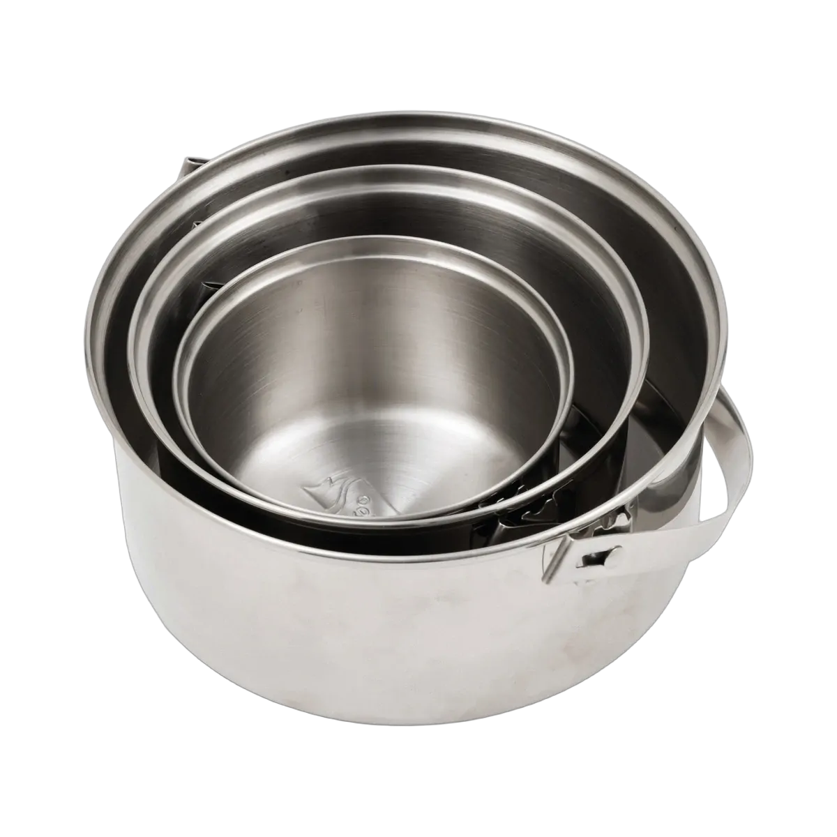 Featuring 3 generously sized pots with lids which double as plates, this 6 piece stainless steel set is perfect for the camp kitchen. Durable handles on each pot and lid ensures safety when in use. The set packs neatly away into the largest pot and comes with a handy mesh storage bag.