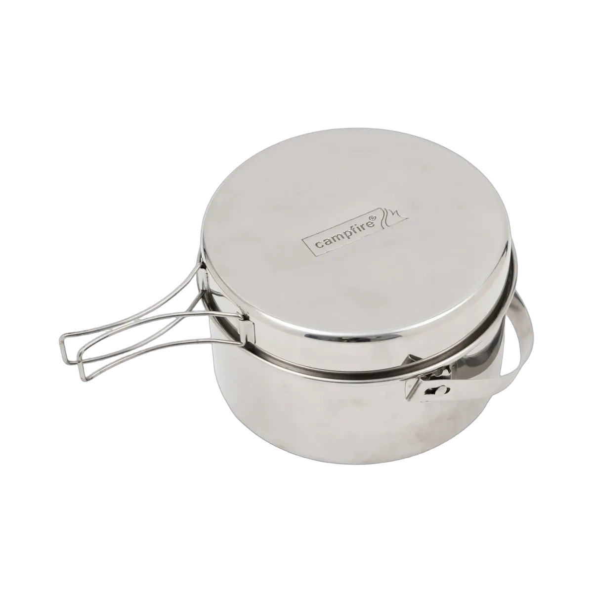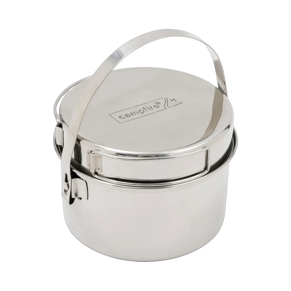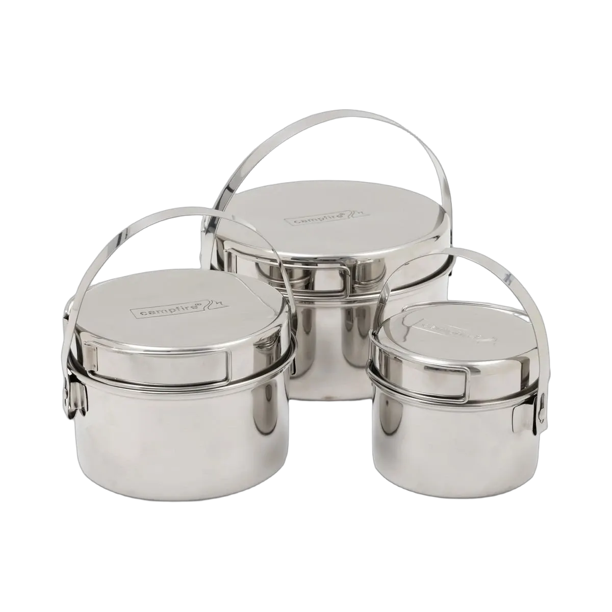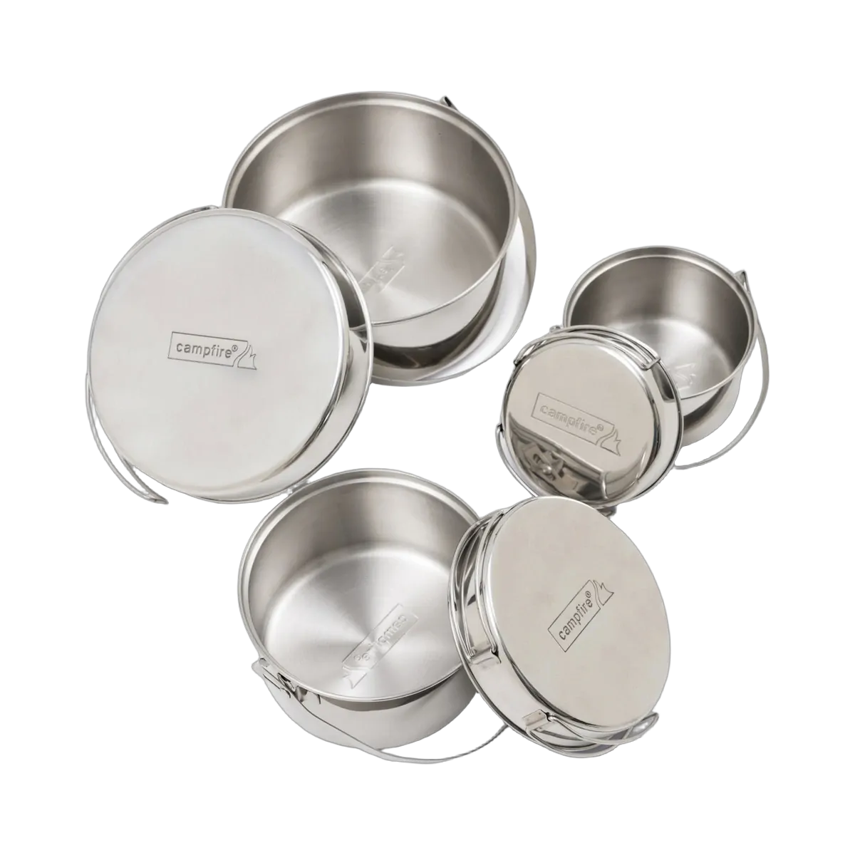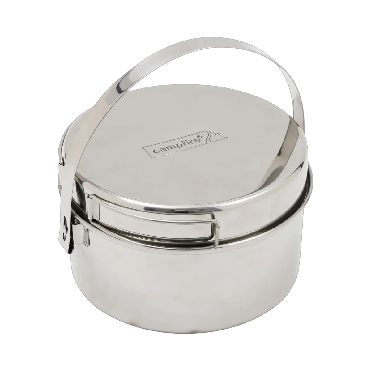 Featuring 3 generously sized pots with lids which double as plates, this 6 piece stainless steel set is perfect for the camp kitchen. Durable handles on each pot and lid ensures safety when in use. The set packs neatly away into the largest pot and comes with a handy mesh storage bag.