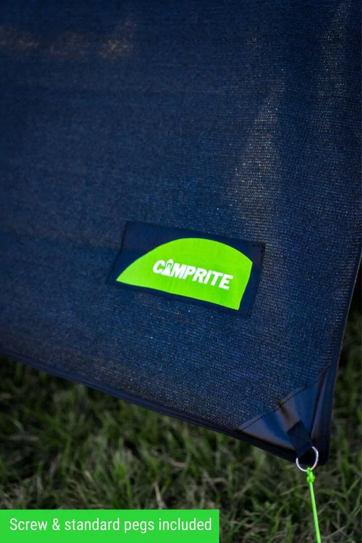 The screen features hemmed edging, re-enforced D-Rings together with additional side attachment points so you can attach to awning legs or an additional end screen if setting the screen straight down for privacy.