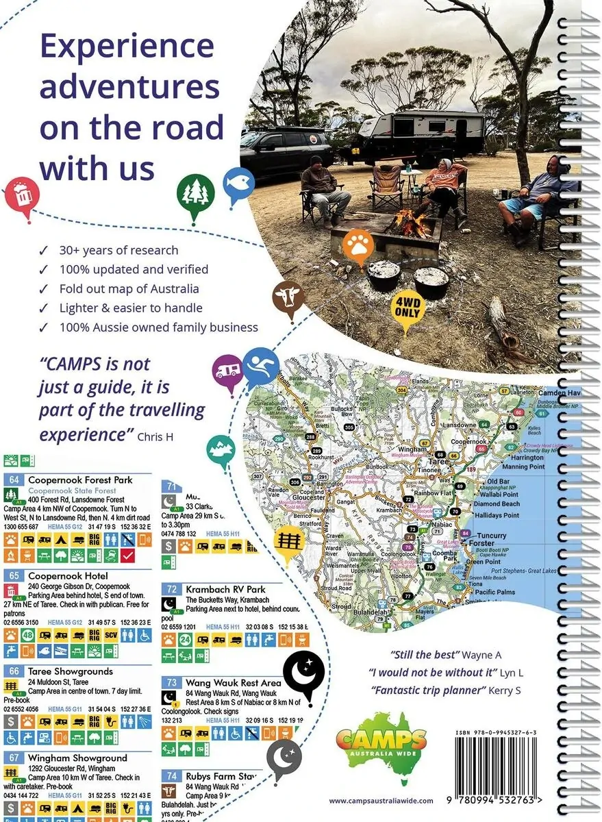 Camps 12 is the only guide you will need for free and low-cost camping across Australia, featuring verified free and budget camps. Travellers can tell if a site is free or paid, national parks, state forests, showgrounds, pub stays, RV parks, station and farm stays on the maps and listings. Only remote caravan parks that are important wayfinders or outback roadhouses are found in this streamlined edition.