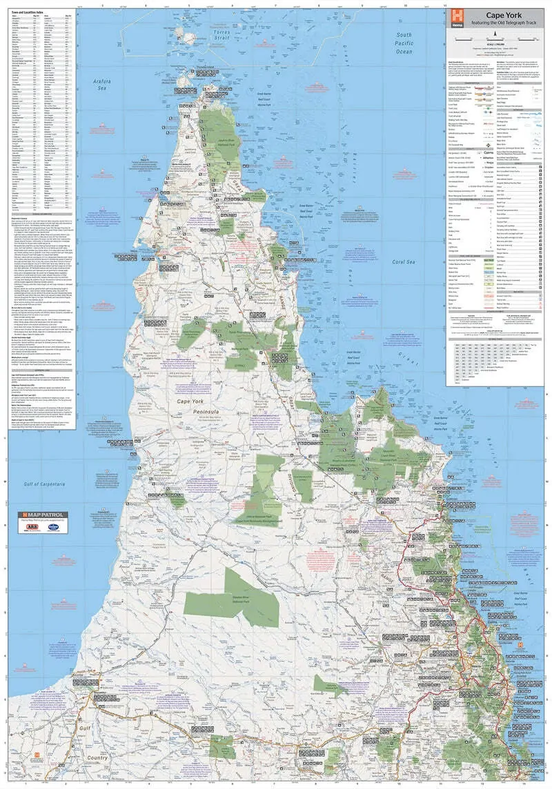 A large map that features updated mapping of Cape York that ranges from below Innisfail to the Tip, with numerous points of interest and GPS field-checked 4WD tracks marked on the map. The mapping features 4WD tracks, touring information, points of interest, facilities and distances, making it the perfect trip planning tool and reference map.