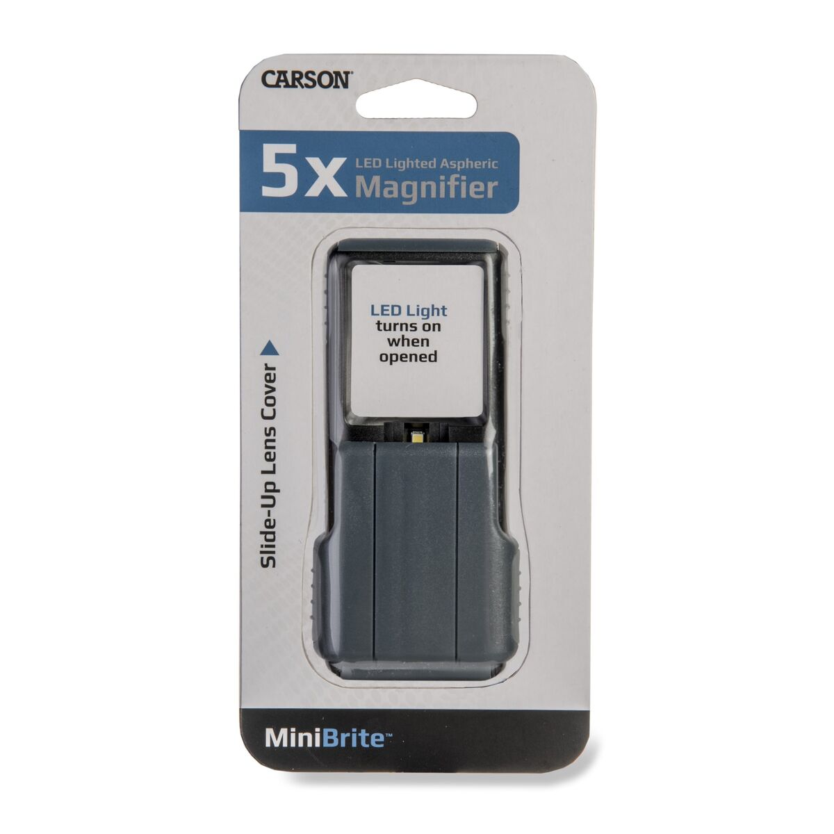 MiniBrite(tm) pocket magnifier is a compact, 5x power, LED Lighted, slide-out Aspheric magnifying glass.