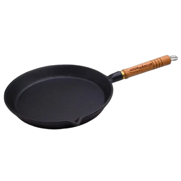 Whether you're cooking over a flame on the BBQ or on the campfire coals, our Cast Iron 30cm Frypan offers you a perfect and simple cooking surface for any recipe. It also features a wooden handle to reduce heat transfer.
