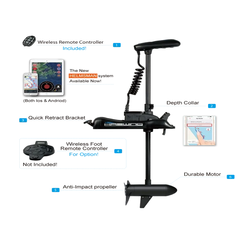 24V 80lbs thrust 60″ shaft, 45A maximum draw, height adjustable 316 stainless steel shaft. Weight: 18.1kgs. Spot lock on hand remote and can also be controlled using Helmsman APP on Android or IOS device including Apple Smart Watch.