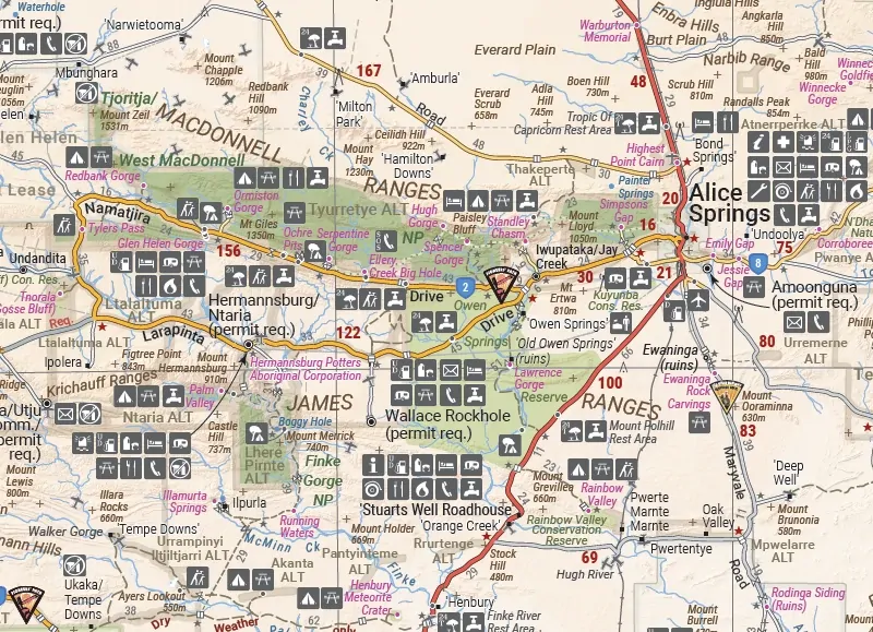This map of the Central Australia region is ideal for discovering some of Australia's most iconic landscapes. The main map covers the area around Alice Springs, including Uluru, Kata Tjuta, West MacDonnell Range, as well as the Simpson Desert, and popular tracks such as the Hay River Track. This map stretches over both sides of the map at a scale of 1:1,500,000 and has extensive detail on indigenous areas (and where permits are required), national parks, deserts, fuel locations, camping areas, and points of interest. The reverse side of the map includes:a table of National Parks and Reserves with facilities shown (such as toilets & showers, camping allowed, BBQ, etc..)a listing of Information Centres with address and contact detailsInformation on the area’s heritage and exploration, contemporary tourism, outback etiquette, desert tracks and hiking information.