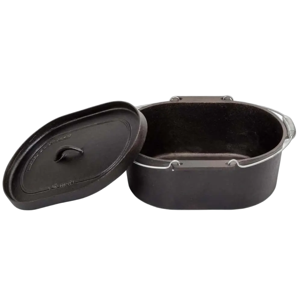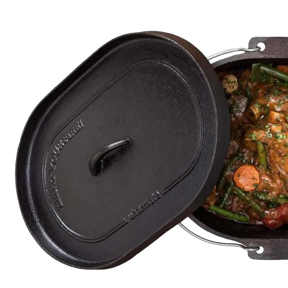 The Charmate Oval Cast Iron Camp Oven is pre-seasoned and ready for use! Its concave lid retains coals for superior heat transfer. The thick walls and base guarantee consistent heat and the wire handles are cool to touch.