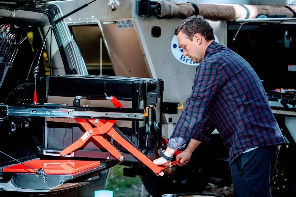 Simply unlock the travel lock mechanism and pull the fridge towards you to full extension. A gas strut-assisted vertical scissor lift action and safety latch system then allows for safe and easy lowering of your fridge.