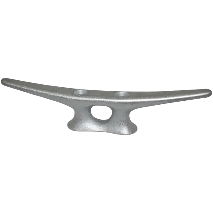 Economical solid base plain cast aluminium alloy cleats for aluminium boats or lightweight dockside cleats. 2 bolt fastening holes through centre.