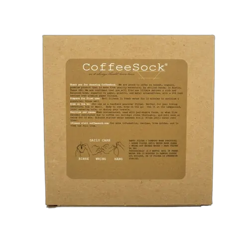 CoffeeSock filters are durable and may last a year or more. CoffeeSock filters are a reusable alternative to paper filters and nylon sacks. All of our filters out-perform any comparable disposable and reusable filters. Cotton absorbs some of the oils released from coffee beans yet lets acids pass through. The resulting cup is clear crisp, rich and robust with all the acid of paper brewed coffee, without the paper taste, and all of the richness of French press without the heavy oiliness. CoffeeSock filters are made with Certified Organic Cotton. Cotton imparts no flavor on the finished brew unlike paper. Cotton is 90% cellulose, which is a tasteless and odorless compound that is insoluable in water. Wood is 40-50% while Hemp is approximately 45% cellulose. CS filters are made in Austin, Texas. All filters are sewn and packaged by happy human beings making a fair and living wage.