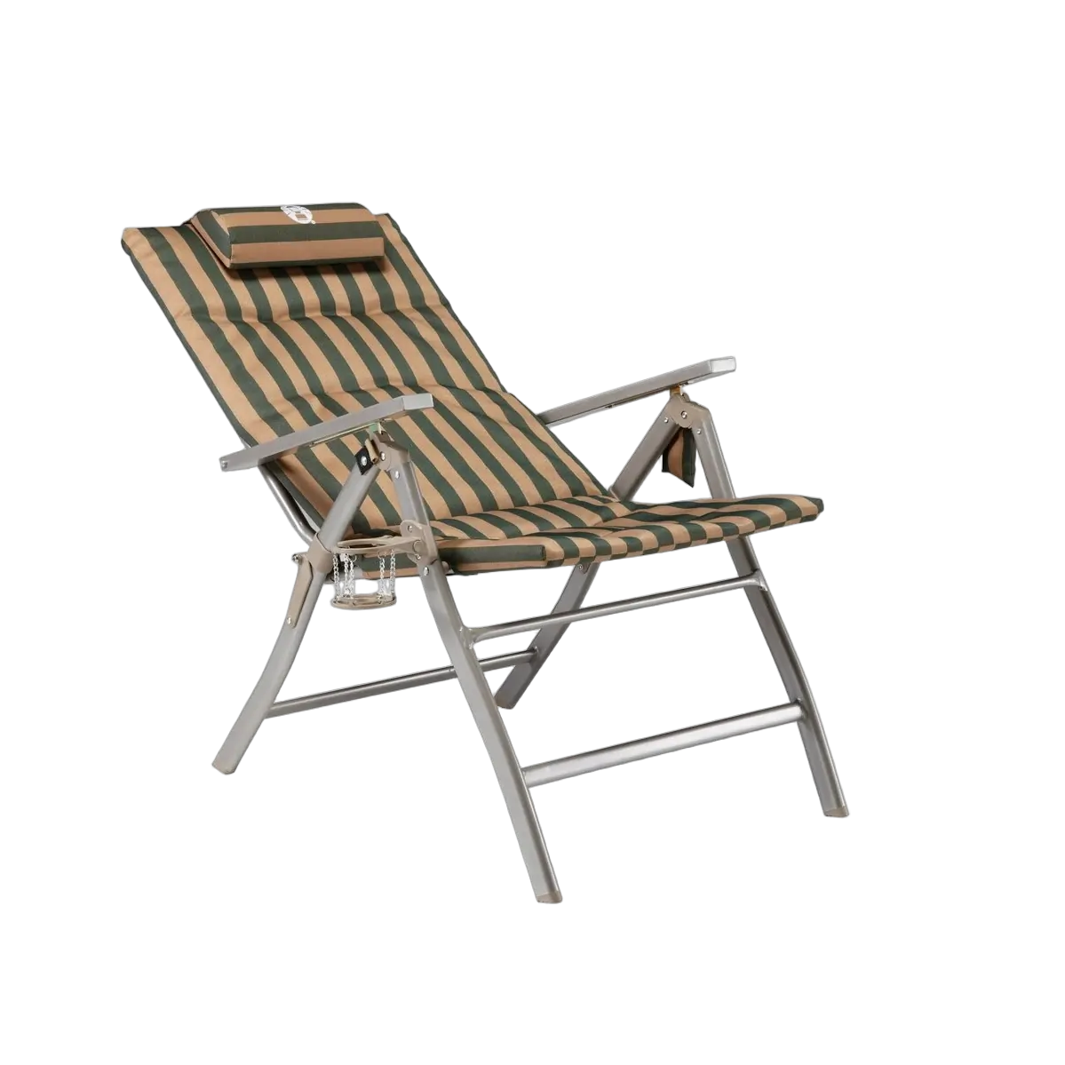 Powder coated 25mm steel frame and arm for extra strength. 5 position reclining chair with easy-to-use arm mechanism. Fully padded seat and back with a fold back head rest. Fold out Glassp™ drink holder fits cans, bottles and wine glass stems. Carry strap included. Folds flat and has a safety locking device. Weight Capacity: 130kg.