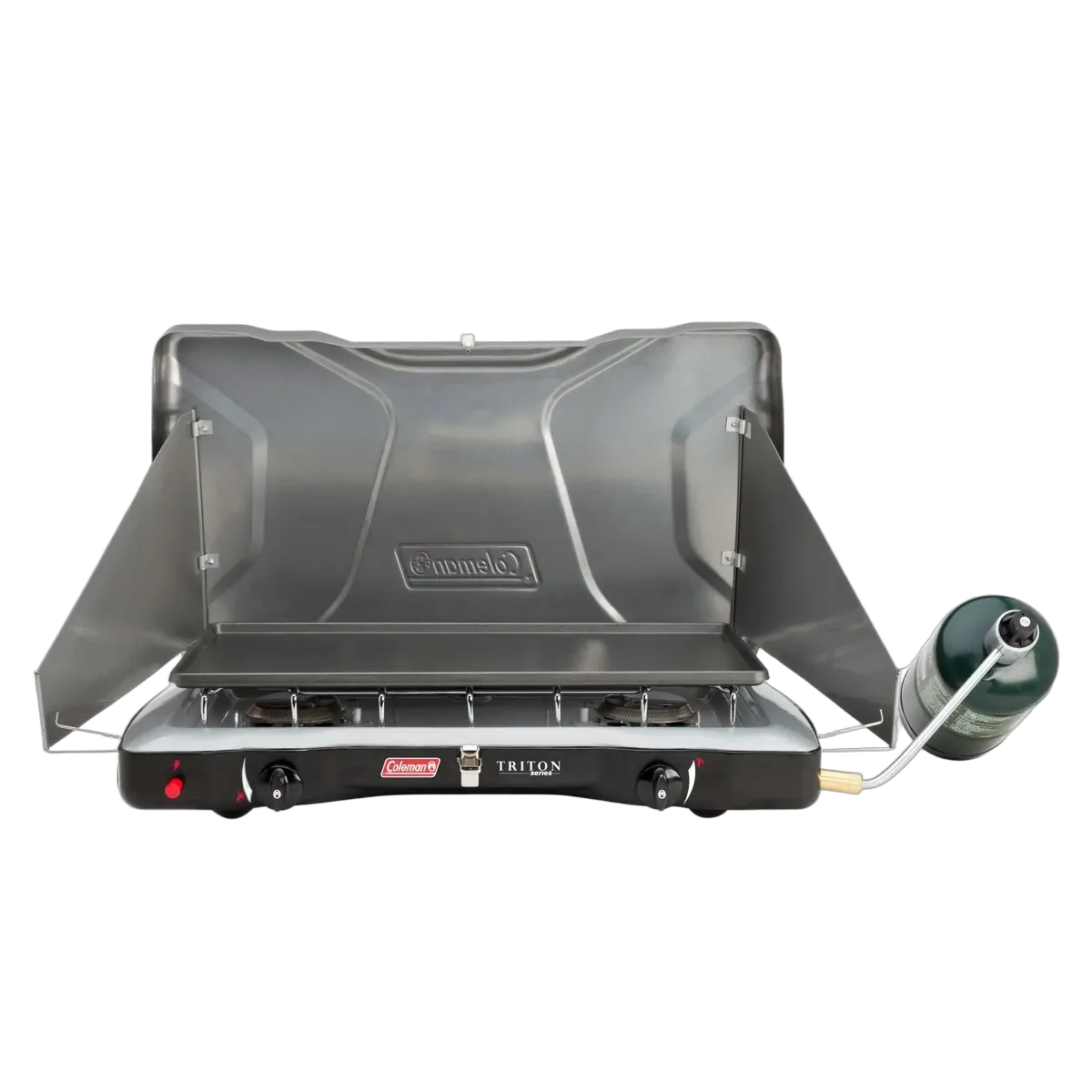 Take camp cooking to the next level with the Coleman Triton 2 Burner Stove. All it takes to start cooking is one touch of the Insta-start push button ignition. PerfectFlow pressure control keeps the heat steady, while WindBlock panels help shield your fla