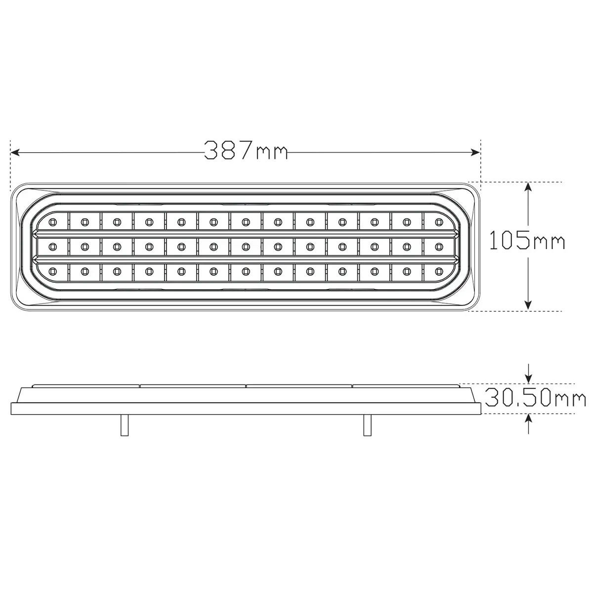 Fitting InstructionsSeparate the base plate from the lamp and horizontally mount it onto a flat surface using screws provided, ensuring the arrow on the lens is pointing outwards of the vehicle. Run the wire through the hole in the fixing surface, then re-align the lamp and clip it into the mounting base using light pressure to ensure it sits in place correctly. Please refer to ADR 13/00 for mounting instructions. Technical Drawings