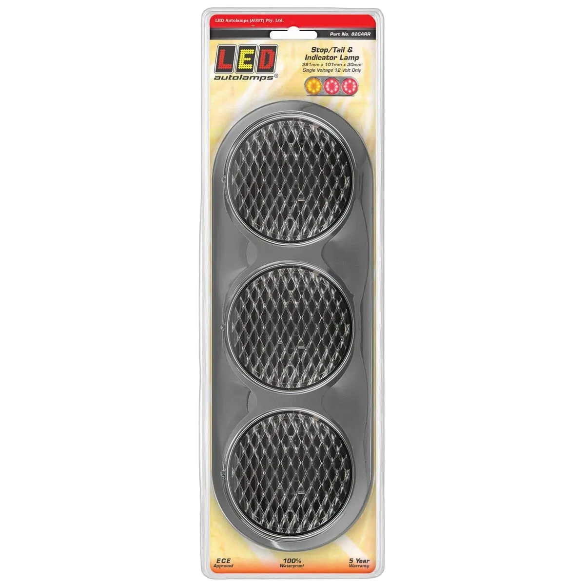 Fitting InstructionsHorizontally mount bracket onto flat surface with screws provided, ensuring TOP markings are positioned above centre holes. Remove backing from 3M tape on back of lens, run wires through desired centre hole and align the locator nodule on edge of lens with the corresponding indentation on bracket. Apply firm hand pressure to ensure lamp adhesion. Repeat for each lens until all are installed securely. Refer to ADR 13/00 for mounting instructions. Technical Drawings |
