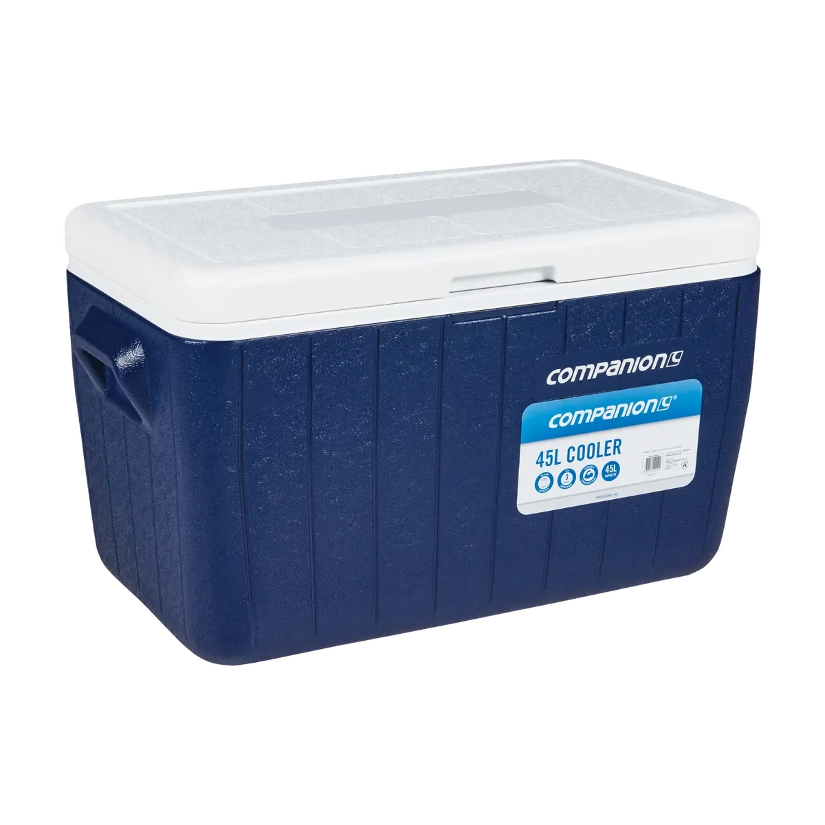 A 45L cooler with a fully foamed base that retains ice for up to 3 days. It has a friction locking lid, a drain plug, and recessed handles for easy transport.
