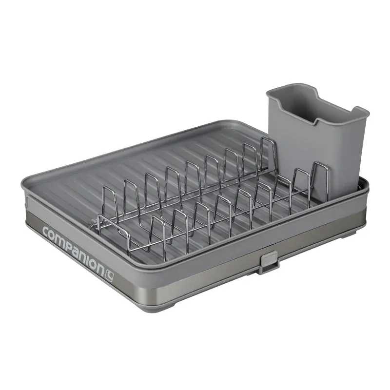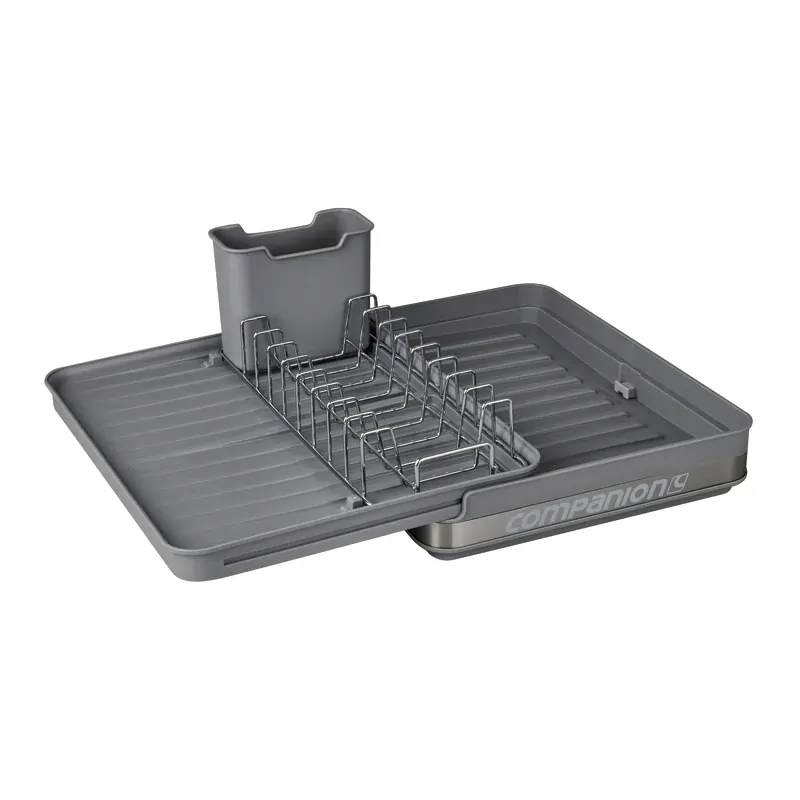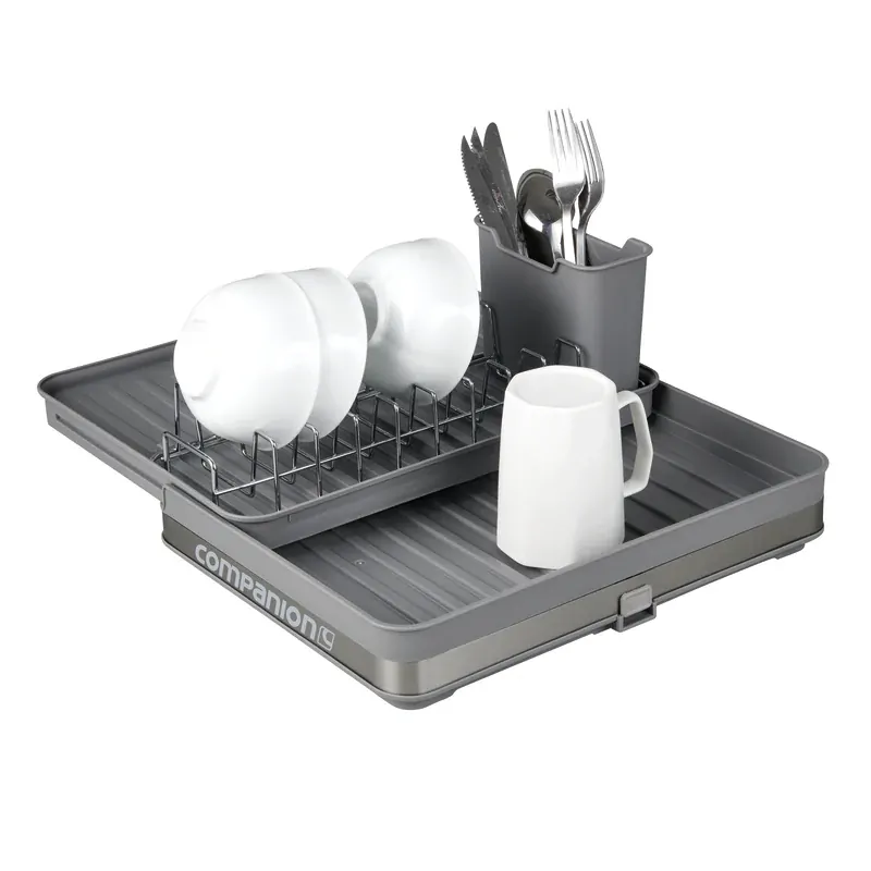 The Companion Deluxe Compact Dish Rack is perfect for caravans, offering both a compact and expandable design for small or large spaces. It includes a cutlery holder and dish holders, with water runoff directed into the base. Choose to collect the water or drain it into a sink using the built-in bung. Packs away small for easy storage and convenience on the go!