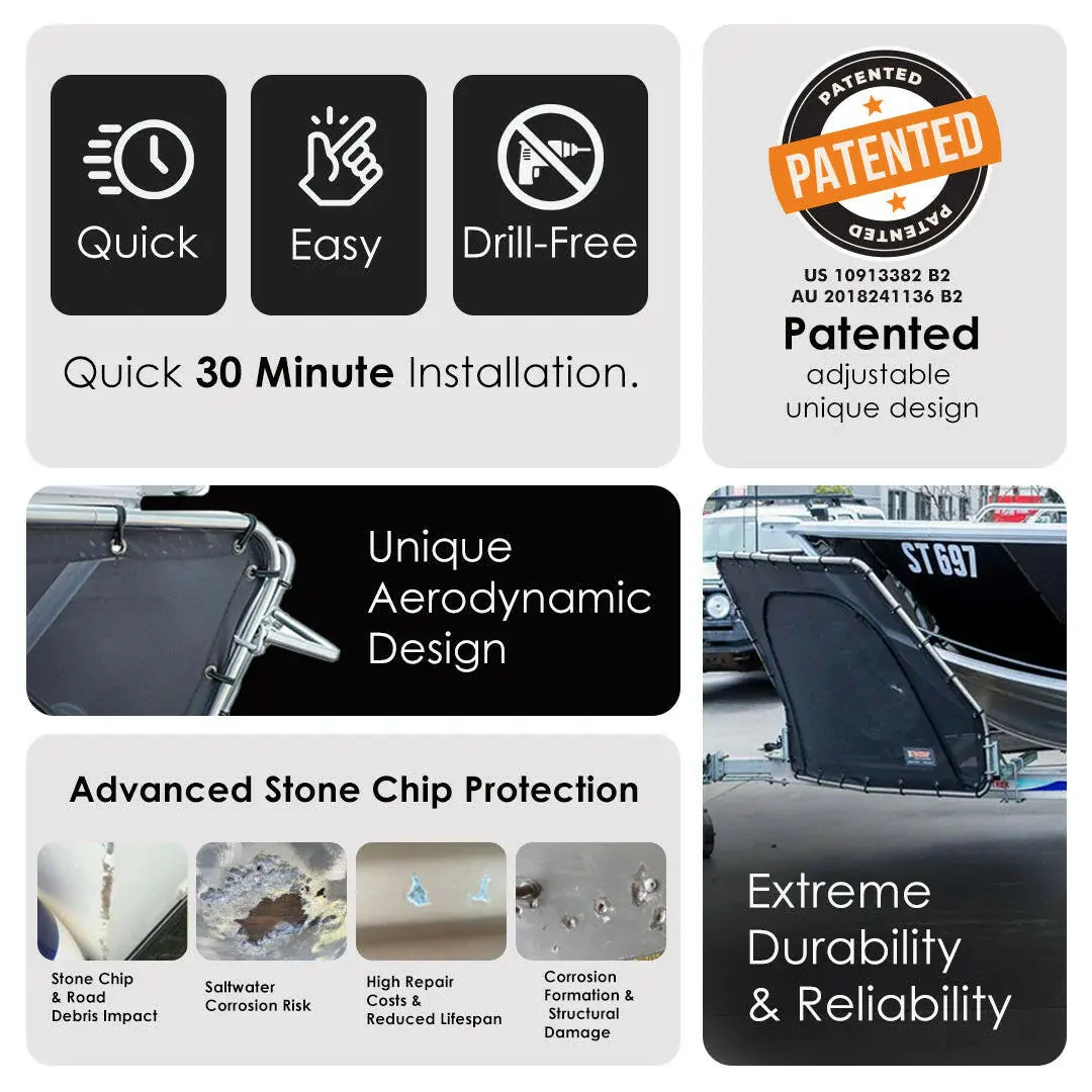 Keeping your boat in top condition - your boat may be one of your most prized possessions. But towing your boat through off-road conditions or simply unprotected exposes it to stone and road debris that can damage the hull and its gel coat or painted aluminium finish. Stone chips, scuffs and general degradation of the surface occurs, which not only looks unsightly but can also reduce the re-sale of value of your watercraft.