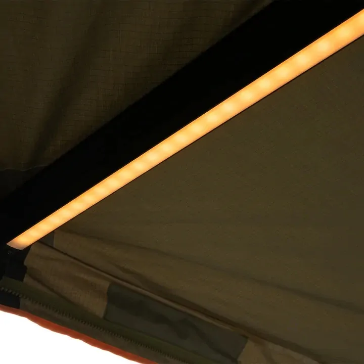 - Integrated dual-colour (white and amber) dimmable LED lights on four rafter arms. (power bank not incl.)