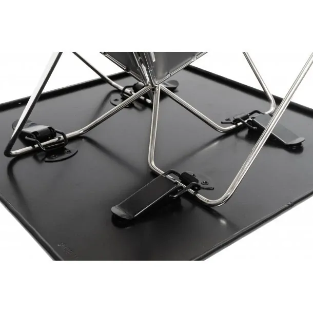 The cast iron trivet provides a flat base for the coals to sit as well as increasing airflow for your heat source while the steel base plate acts as a heat shield and will catch any falling embers and makes for an easy clean up.