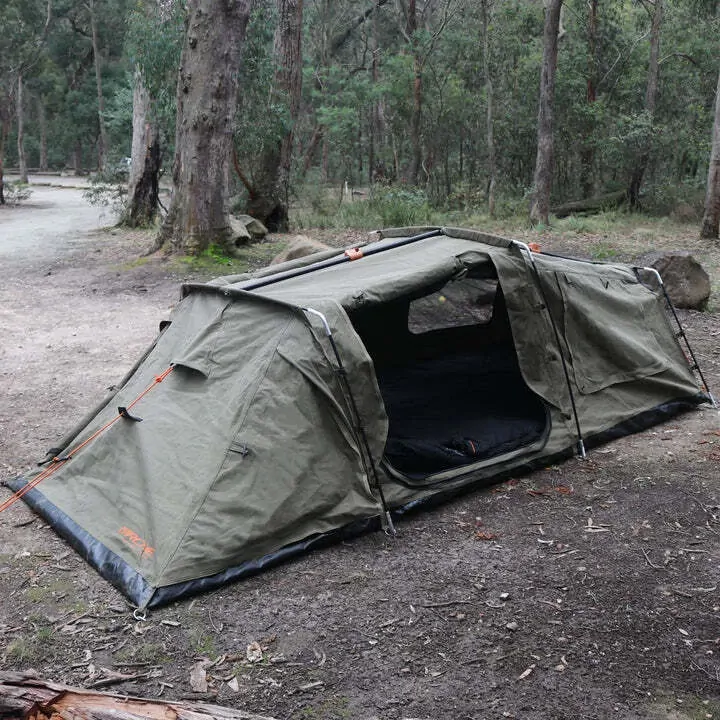 The Dirty Dee + swag is made from premium 420gsm ripstop polycotton canvas with an impressive 800mm waterhead rating. There’s also internal seam sealing and a reinforced, heavy-duty 600gsm PVC bucket floor to keep you dry in those rainy conditions. It comes with a premium quality, high-density 70mm foam mattress with a removable cover. The canvas swag bag is perfect for storage and protection while you’re on the go - just throw it in the back of the car or on the roof rack and get on the road.