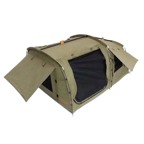 If you're after the ultimate freestanding tourer, the Dirty Dee swag is made for you. With its roomy design, this Darche swag is both functional and comfortable - a true home away from home. Its no surprise this swag is a favourite among Darche campers. Setup is a breeze with the unique trigger lock ridge poles. Like all Darche ridge pole swags, the Dirty Dee is free standing so you can use it with the Darche XL Stretcher if you prefer to be off the ground and away from any wandering critters. The huge entry doors on either side ensure that you can enjoy the incredible views. The super-fine mesh windows offer great ventilation, keeping you cool while ensuring you're well protected from the mozzies. The Dirty Dee swag is made from premium 420gsm ripstop polycotton canvas with an impressive 800mm waterhead rating. There's also internal seam sealing and a reinforced, heavy-duty 600gsm PVC bucket floor to keep you dry in those rainy conditions. It comes with a premium quality, high-density 70mm foam mattress with a removable cover. The canvas swag bag is perfect for storage and protection while you're on the go - just throw it in the back of the car or on the roof rack and get on the road.