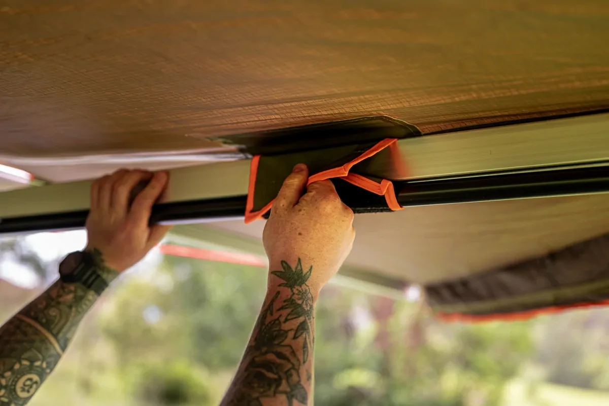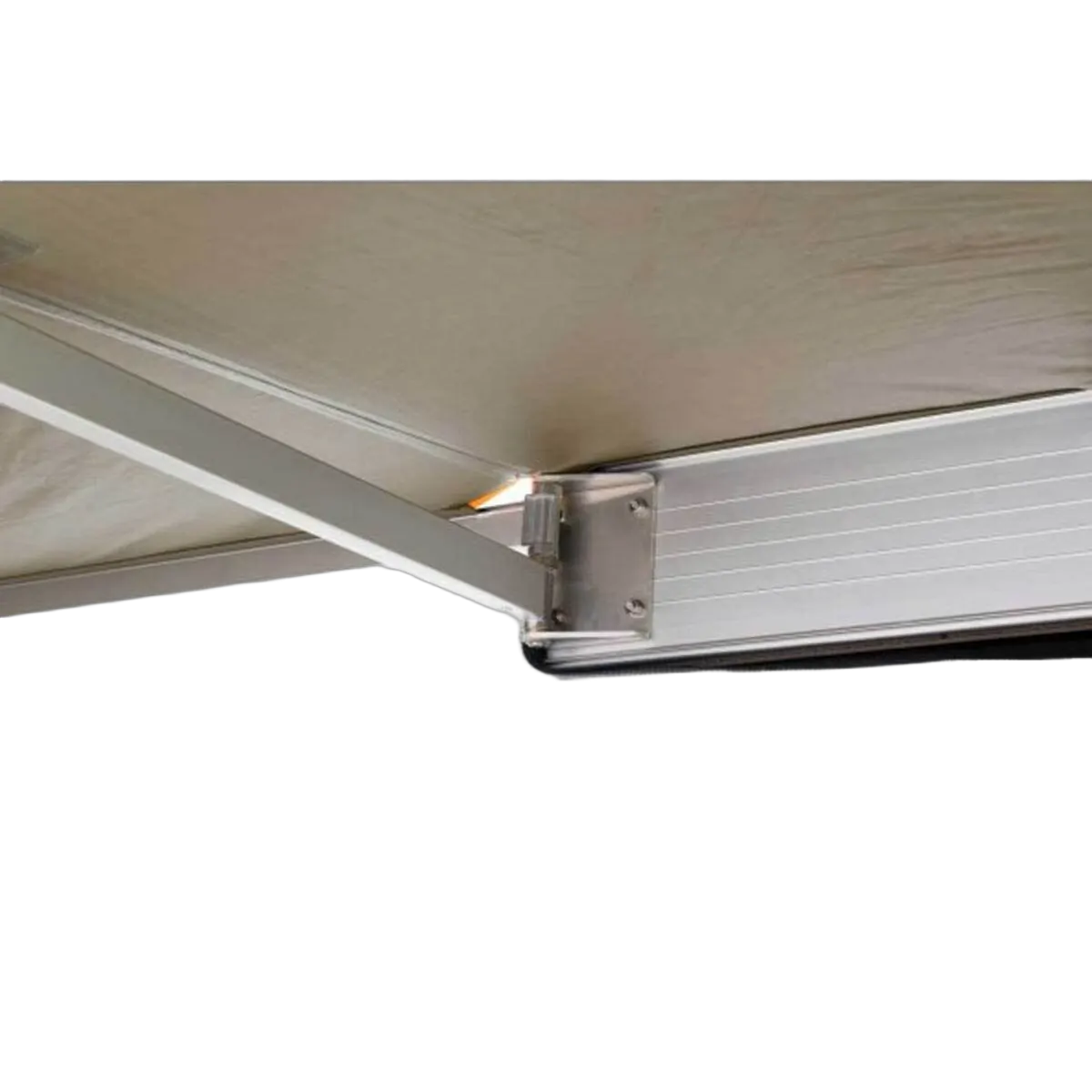 (New) Aluminum hinge system. Hinged from both ends, the awning spans 6m along the side of the vehicle