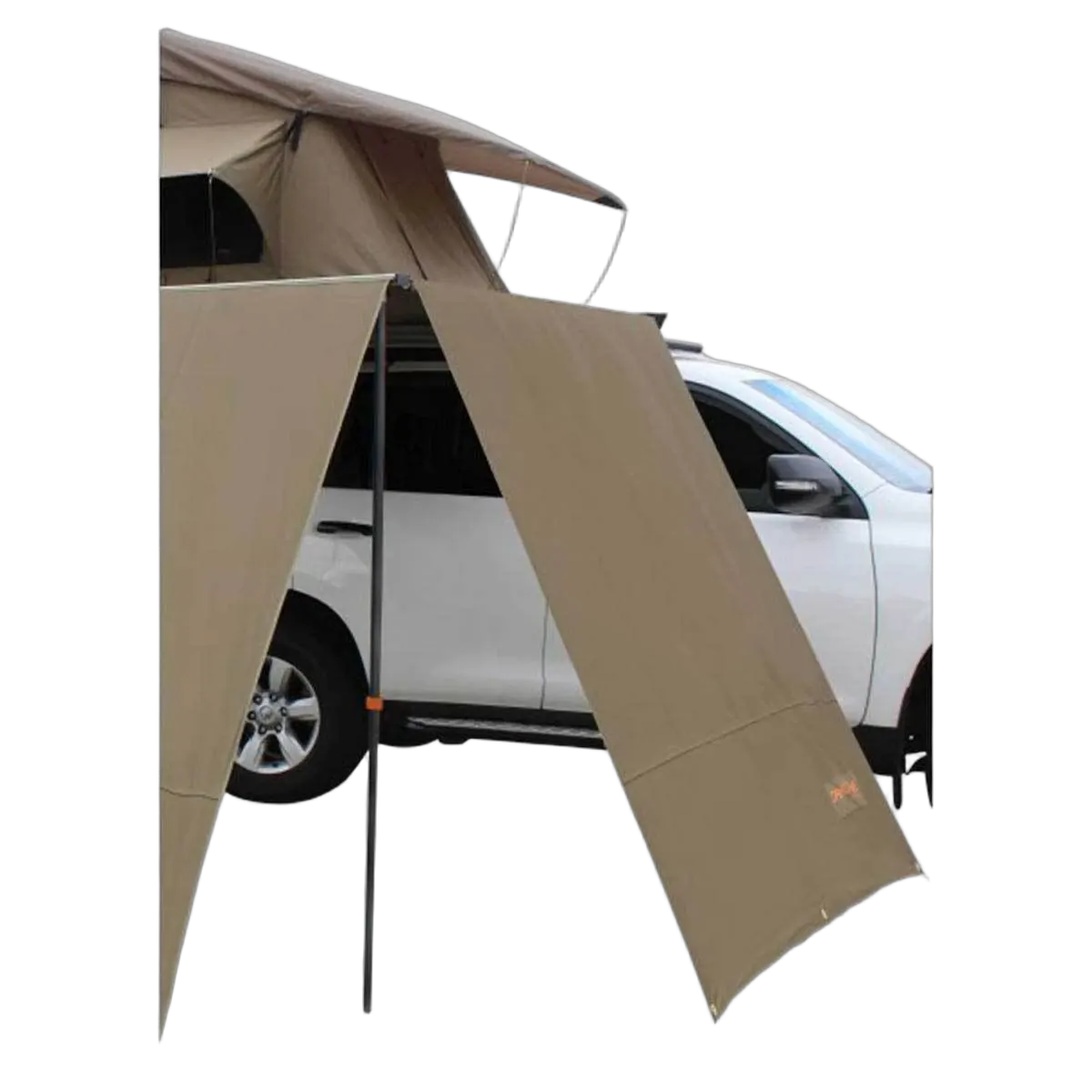 - Side extensions attach to awning via Velcro straps to the awning’s rafter arms