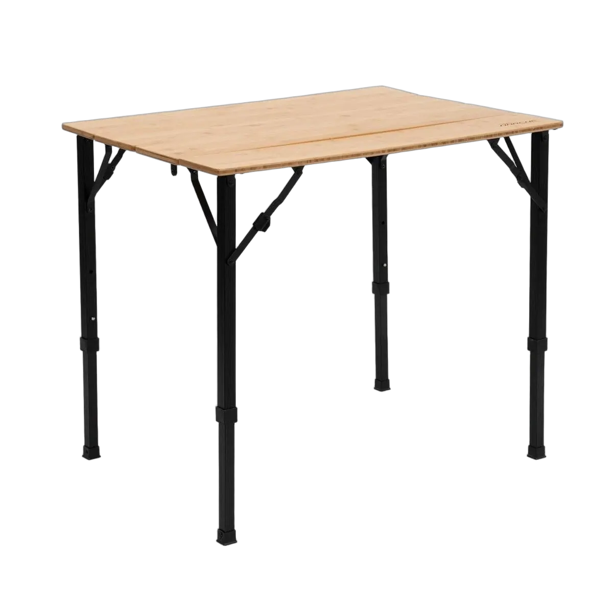 Compact folding tables with multiple height settings for dining and food preparation.