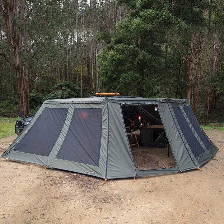 The box-tube alloy arm system is light, strong and built to last. Currently available in left-hand side mount configuration (Australian passenger side), you can put one on the car, on the camp trailer or the shed; your options are endless. With multiple wall panels to choose from (sold separately), you can set up one as a wind and weather break or add them all for a whopping 20.5m² of shelter around your vehicle.