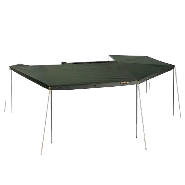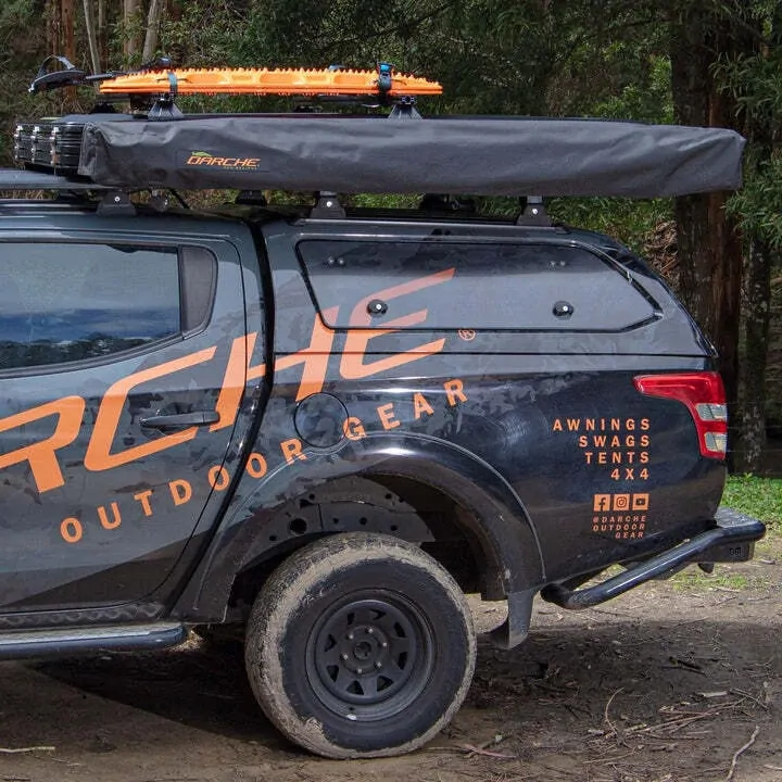 The Eclipse 270° Awning brings next-level shade to your 4WD camping setup. Offering a huge 11.5m² of instant cover, it spans the full length of your vehicle, then wraps around to the rear, giving you greater cover than a straight awning. Designed for an easy one-person set up, the unit is freestanding during set up and pack down. The heavy-duty alloy swivel hinge system holds the entire kit up while you extend and tension the awning arms and release the three pivoting alloy telescopic leg poles stowed along the rafters. Attach the final leg poles and you'll be under cover in a matter of minutes.