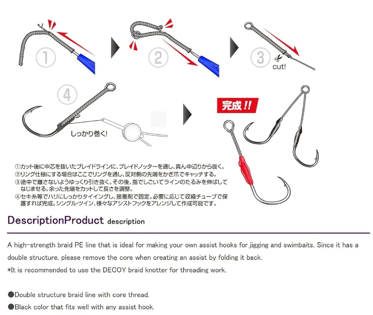 A high-strength braided PE line that is ideal for making self-made assist hooks such as jigging and swim baits. Since it has a double structure, please remove the core when creating an assist by folding it back.