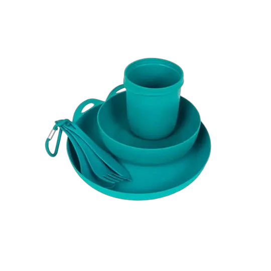 Mug, Bowl: Glass Reinforced Polypropylene; Plate & Cutlery: PP with 30% glass; Stuff Sack; polyester mesh & nylon ripstop fabric