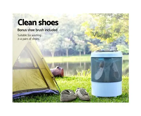 Need to a better way to wash your clothes while on road trips and out camping? Then our Devanti Portable Washing Machine is just the thing for you. Featuring a lightweight 2-in-1 wash and spin dry design, the washing machine has a powerful wave pulsator that washes and cleans with purpose. It is easy to use with simple rotary knobs for wash and spin-dry functions as well as 15-minute timer control. And no worries too about washing delicate clothes as this machine is gentle on all fabrics with its intelligent wash cycles. Best of all, the washing machine comes included with a shoe brush for you to wash up to four pairs of shoes at once. With a capacity to handle up to a 3kg laundry load, our practical portable washing machine also features a detachable spin basket, built-in handles, reliable copper-wire motor and not least, a quiet and efficient operation at all times.