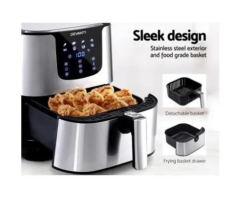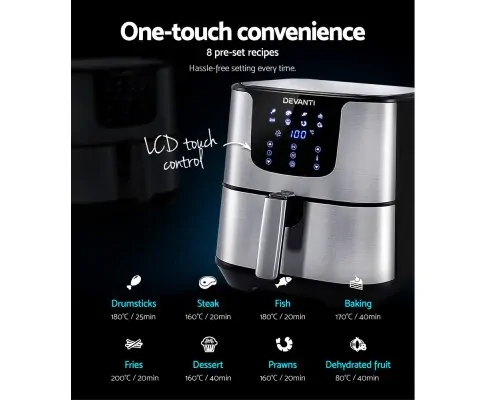 With its stunning and sleek stainless steel exterior, our Devanti Air Fryer turns the ordinary into the extraordinary. And that goes too for its exceptional cooking abilities. With its innovative air frying technology and 1700W of power, your cooking is done efficiently and thoroughly with less odours. Better still, all the wonderful cooking is done without a single drop of oil and yet is as delicious and sumptuous as traditional methods. In fact, foods cooked in in our air fryer have up to 80% less fat than deep-fried foods. This model has an all-in-one design and does not only fry food, but also roasts, grills and bakes. Just set in the cooking mode (up to eight to choose from) or time (up to 60 minutes) and temperature on the easy-to-use LCD touch controls, then leave all the hard work to the air fryer. Other great features include an auto shut-off function, non-stick pan and heat shield vent for good air circulation. The air fryer has a large 7L capacity making it suitable for most families. Most importantly, the components are dishwasher-safe, which makes the cleaning up process as easy as the cooking process.