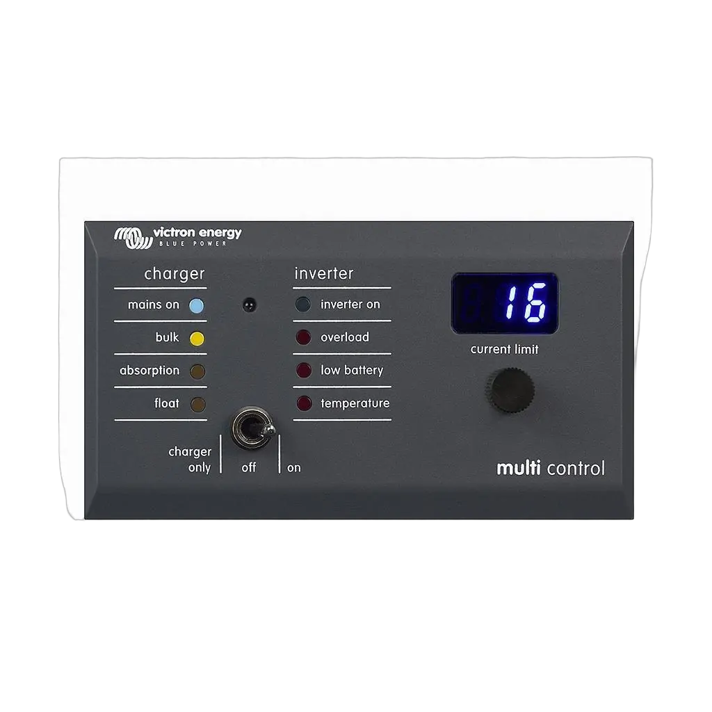 The Digital Multi Control is used to remotely view and adjust AC input currents, and turn on and off the Multi or Quattro. It is designed to integrate cleanly with your boat, vehicle or house system control panel.