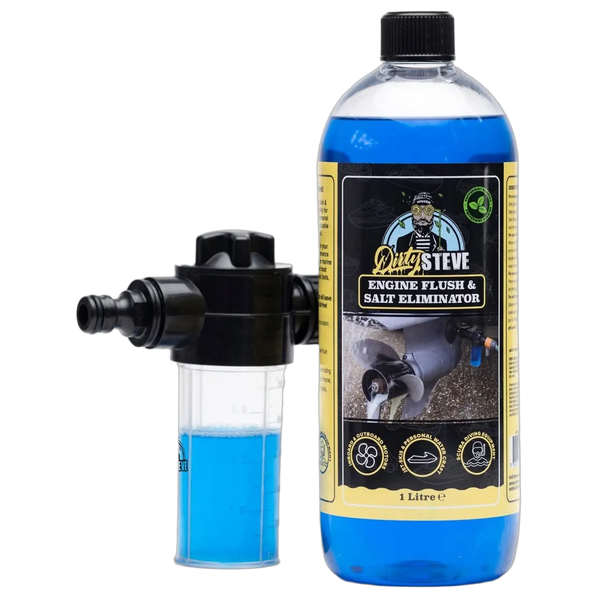 For Engine Flushing Applications: Dirty Steve Engine Flush & Salt Eliminator is best used in conjunction with the Dirty Steve Engine Flush Applicator which simply connects with 'Ear Flush Muffs' and a standard garden hose. Simply fill the container with the solution, turn the dial from 'Rinse' to 'Feed' and turn on the tap. (It is always recommended to check your marine engine manufacturers manual for flushing advice.