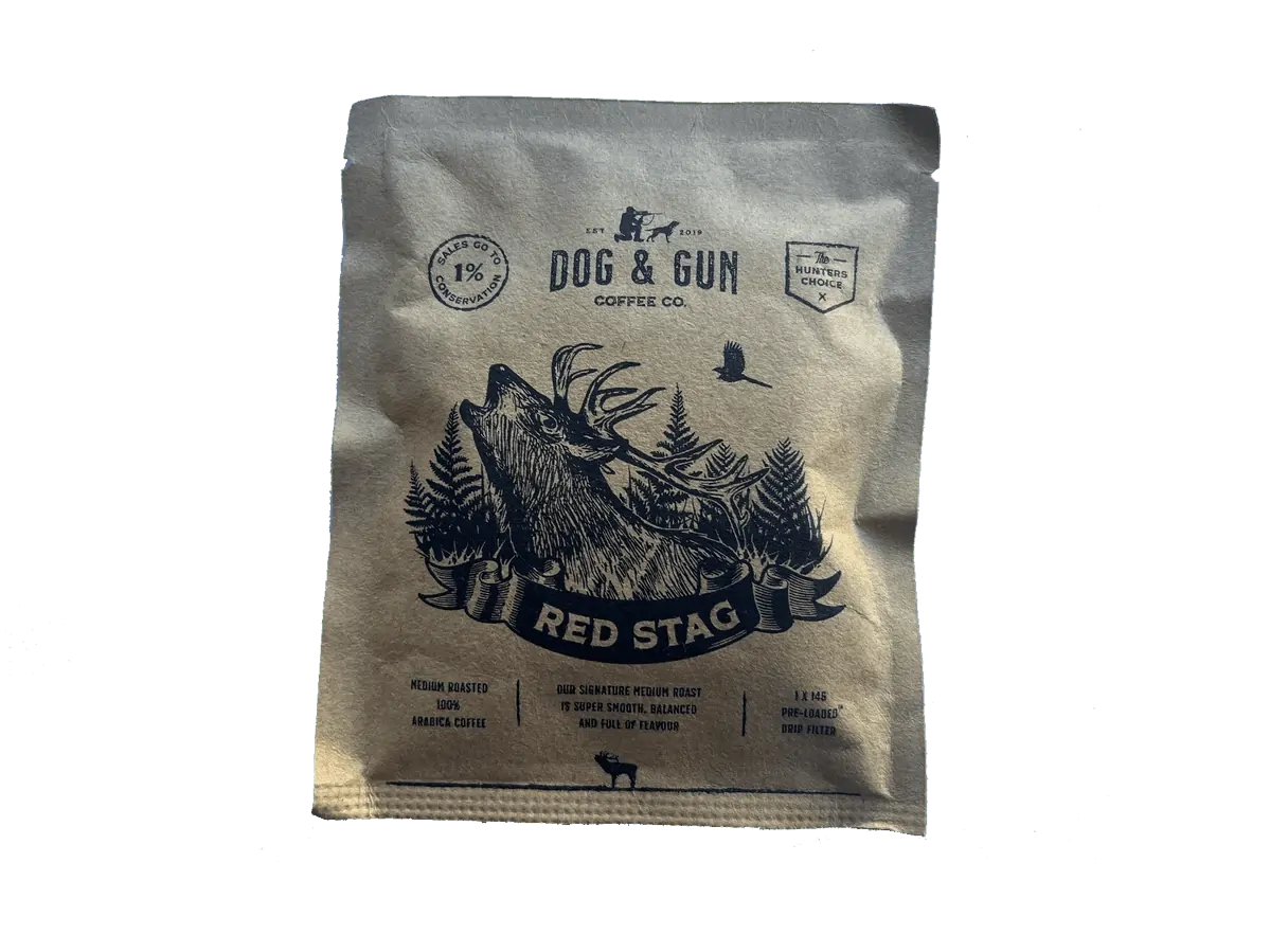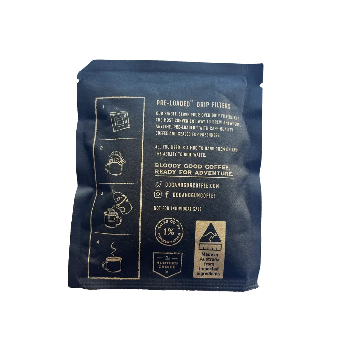The Dog & Gun single-serve pour over drip filters are the most convenient way to brew anywhere, anytime. Pre-Loaded™ with cafe-quality coffee and sealed for freshness, all you need is a mug to hang them on and the ability to boil water.