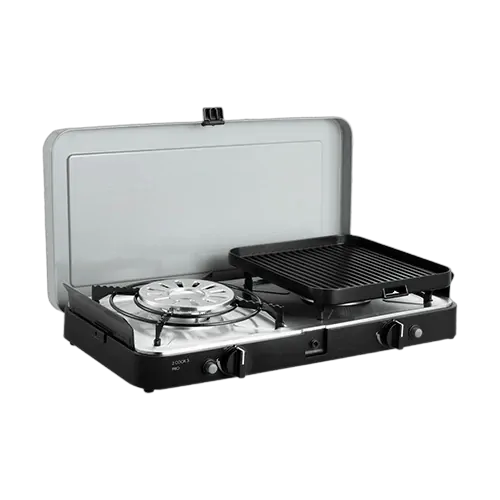 This stylish, lightweight gas barbecue is the ultimate table top companion, with two independent burners. Well equipped for versatile cooking, the Dometic Cadac 2 Cook 3 Pro Deluxe comes standard with two pot stands, an additional coffee stand, as well as a ceramic coated grill plate and ribbed plate. The set also includes a practical handle for removing the grill plates when hot. Two windshields to be fitted on the sides of the camp stove to protect the flame. There’s also a gas button protection to prevent unintentional opening of the gas supply, which is especially handy with small children around.