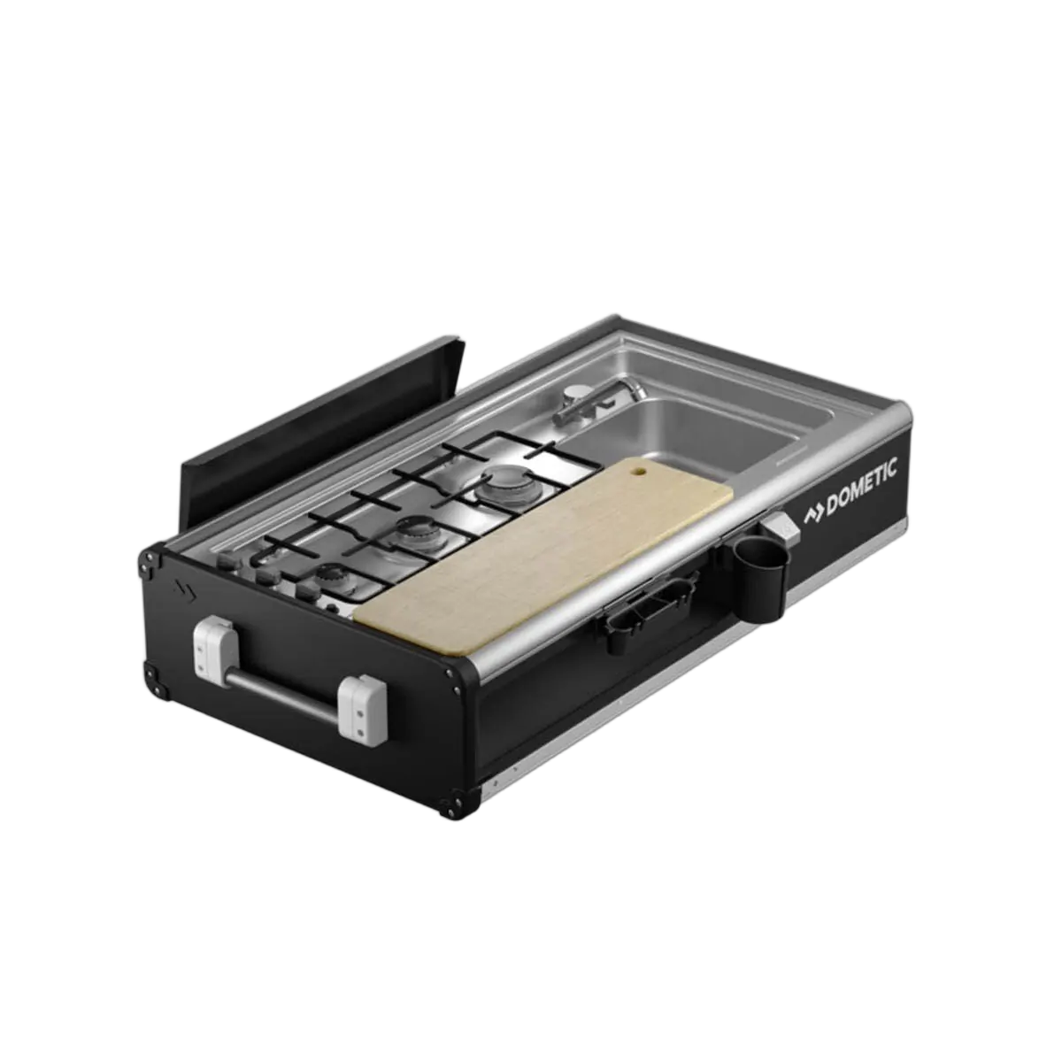 A must have for every adventure, the Dometic Small Slide Out Kitchen functions as a 3-burner cooktop, sink and benchtop. It also features a generous amount of built-in dual side storage to keep dining and cooking equipment secure. Not only does the Dometic Slide Out Kitchen save valuable space, but its telescopic runners also make it quick and easy to pull out and stow away after use. It provides all the kitchen essentials: a sink, double-side access storage, a three-burner cooktop, and a chopping board.