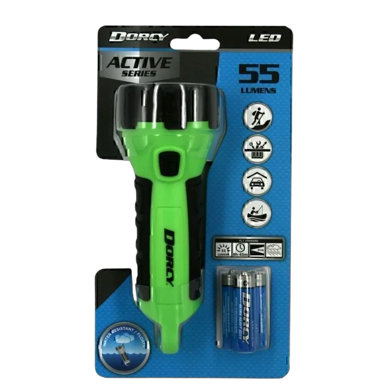 55 Lumens 3AA Waterproof Flashlight Vibrant Colours, Drop tested 8Hr Run time, 31m Beam distance, Carabiner tail clip, Durable hand grip Waterproof & Floating Batteries Included, Retail Counter Display Pack of Six RRP $15.99 incl GST Each
