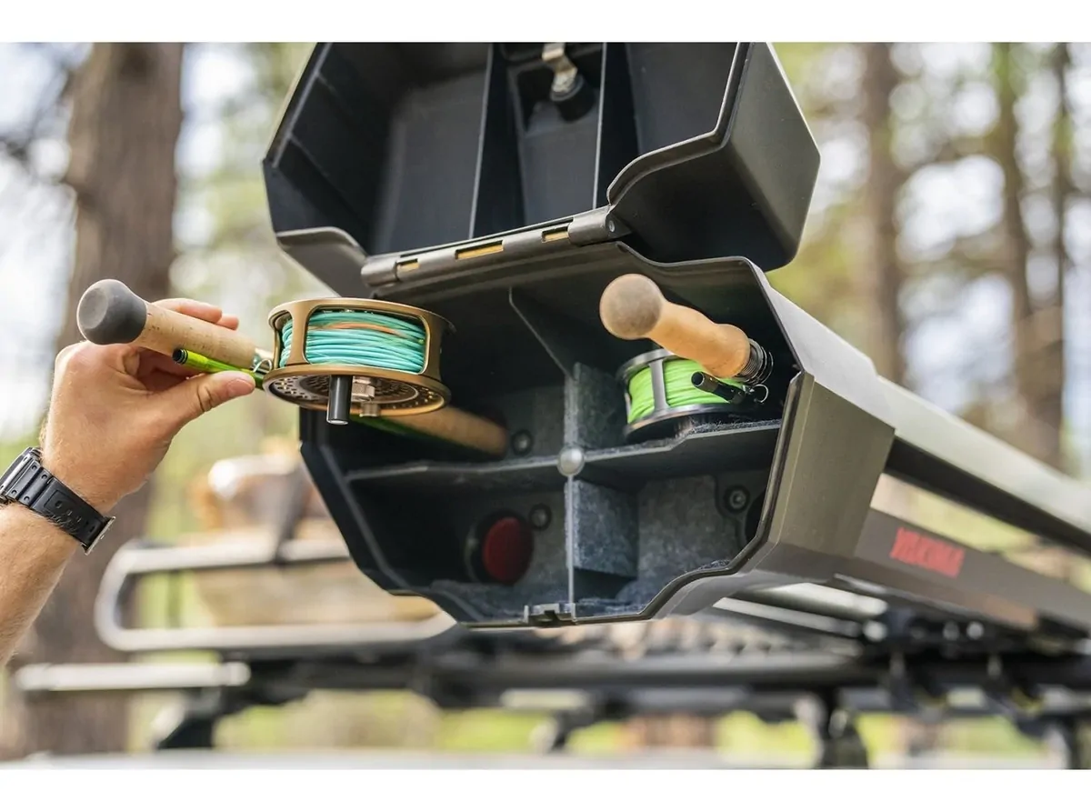 Like the perfect cast, the deluxe DoubleHaul™ rooftop fly rod carrier gets you to that special spot on the water at dawn or that early evening hatch. You're there and ready with the perfect set-up"” up to 4 fully strung-up rods up to 10 ft. long. Rain or shine, your rods are securely locked and protected from the elements. The reel box is designed to protect and fit most reel sizes, with space to carry up to 2 spey rods. To make things even easier, the DoubleHaul mounts to most roof racks with a simple, tool-free universal crossbar attachment. With modern styling and an optional half-length configuration, it's a perfect fit on any size vehicle. Be ready to hit the water when the fish are biting.